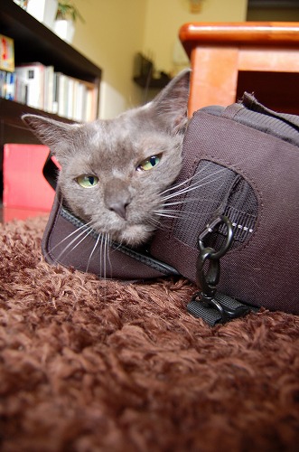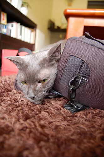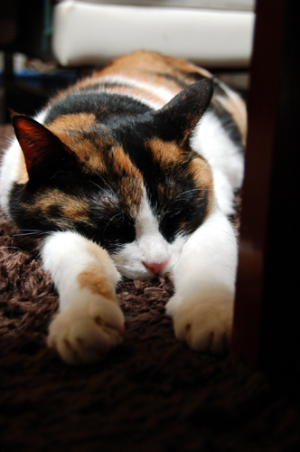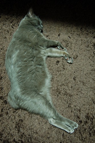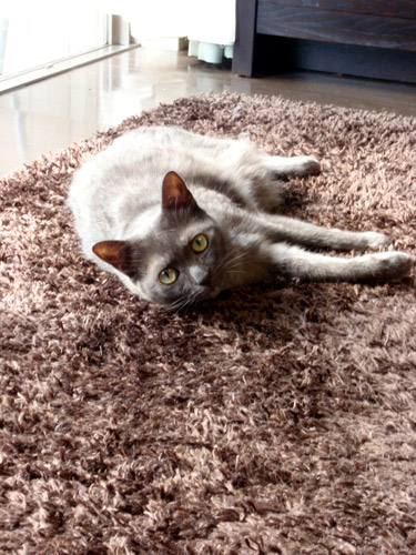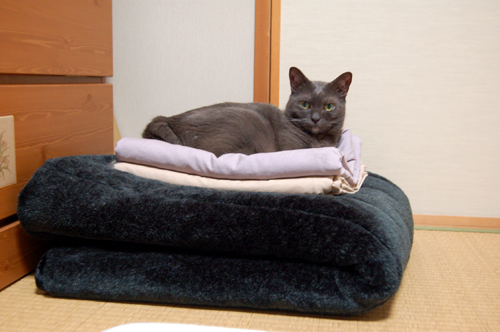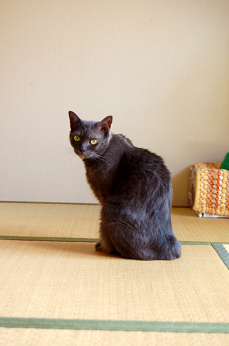 ロシアンブルーMIX(と思われる)のモモたんと三毛猫の花梨。