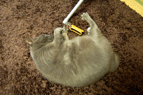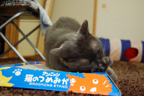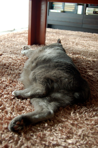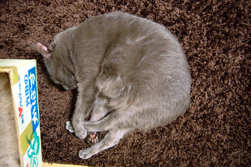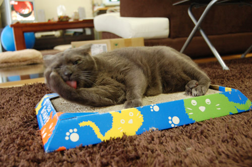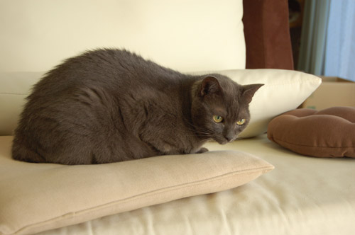 ロシアンブルーMIX(と思われる)のモモたんと三毛猫の花梨。